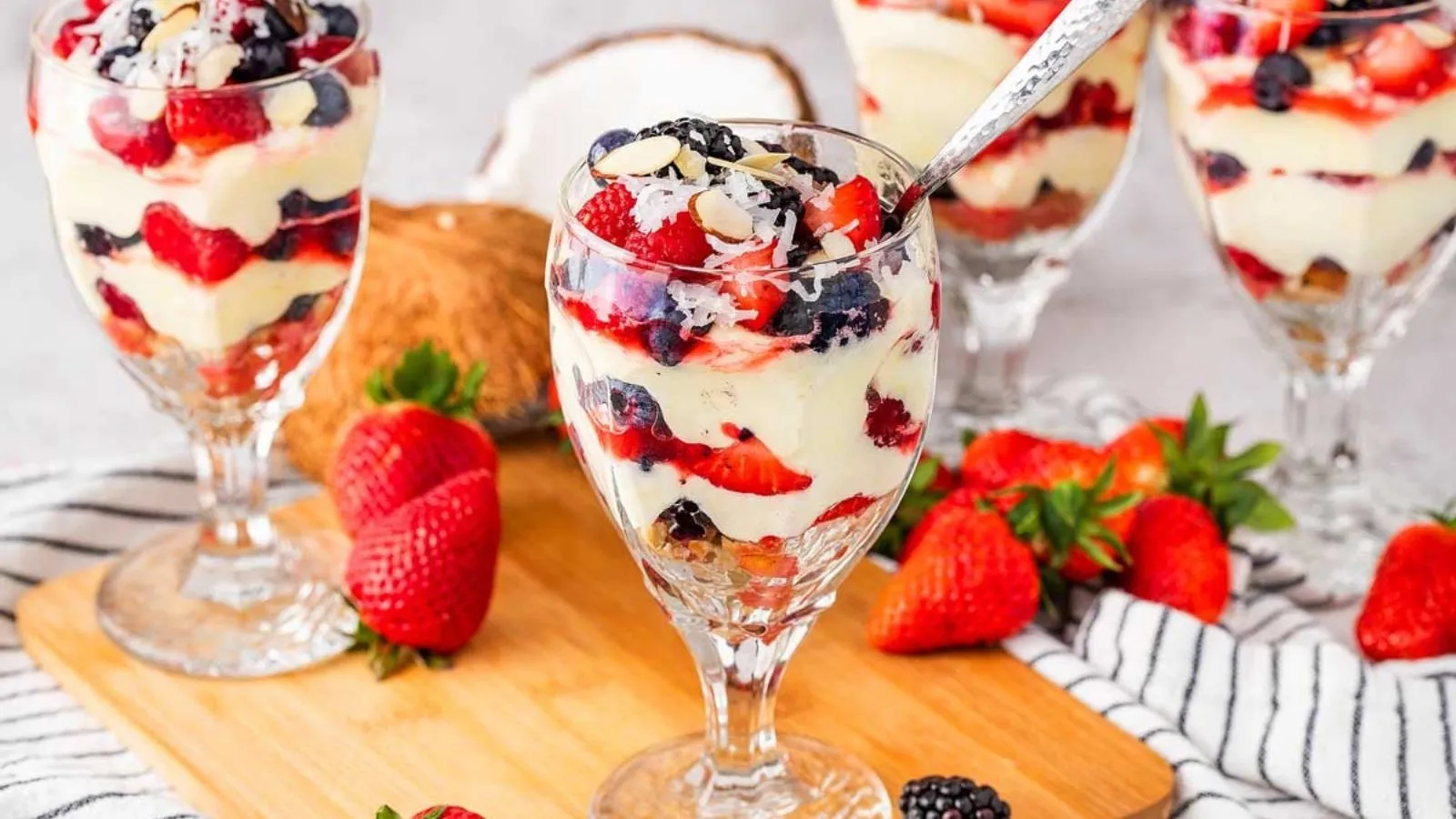 Ricotta and maple syrup form a simple base for this berry-packed parfait. It’s light, easy to layer, and ready in under 10 minutes. Add it to your lineup of red white blue desserts when you want something you don’t have to bake. Serve it chilled for the best texture.