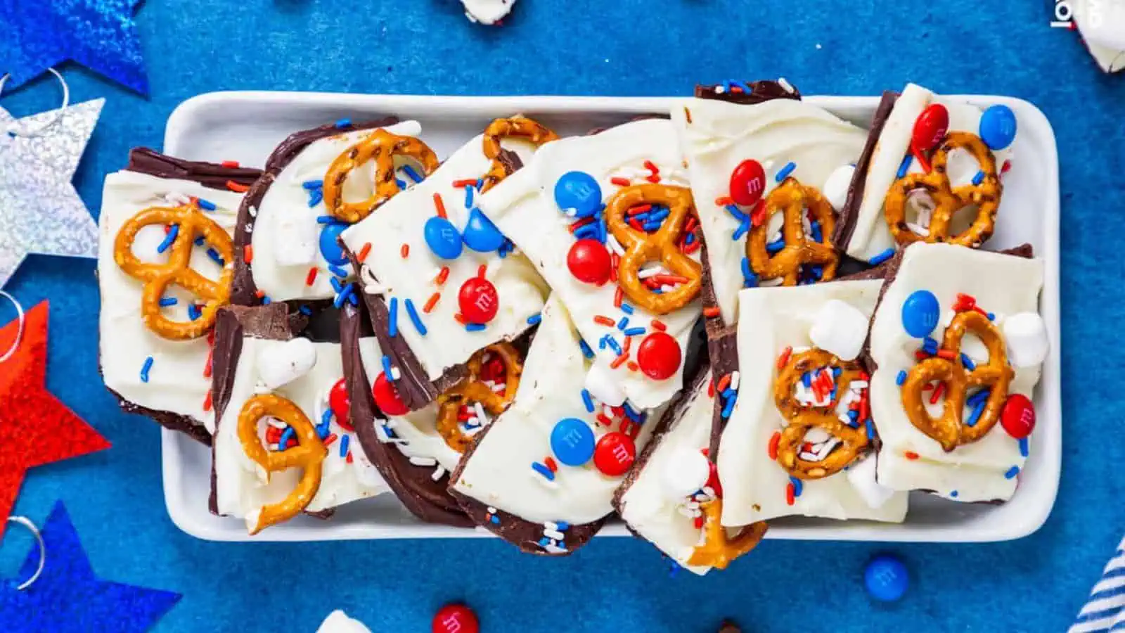 This bark has sweet chocolate, crunchy pretzels, and a fun splash of color. You can break it into pieces for easy serving or wrap them up for gifts. It sets quickly and travels well. It's one of the faster red white blue desserts to throw together last-minute.