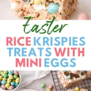 Rice Krispie Easter Treats will definitely add to the fun and festivities of Easter with delicious crunchy rice Krispie cereal that’s coated in melted butter, gooey marshmallows, and chopped mini chocolate eggs.