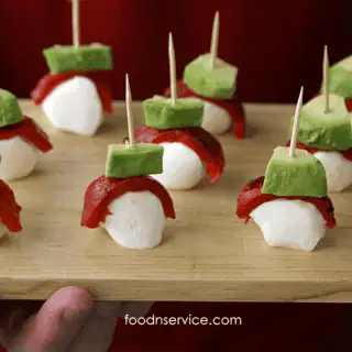 These roasted red pepper, mozzarella, and avocado appetizers consist of 3 simple layers of roasted red pepper strips, mozzarella cheese, and chunks of avocado that are skewered on toothpicks or mini skewers.