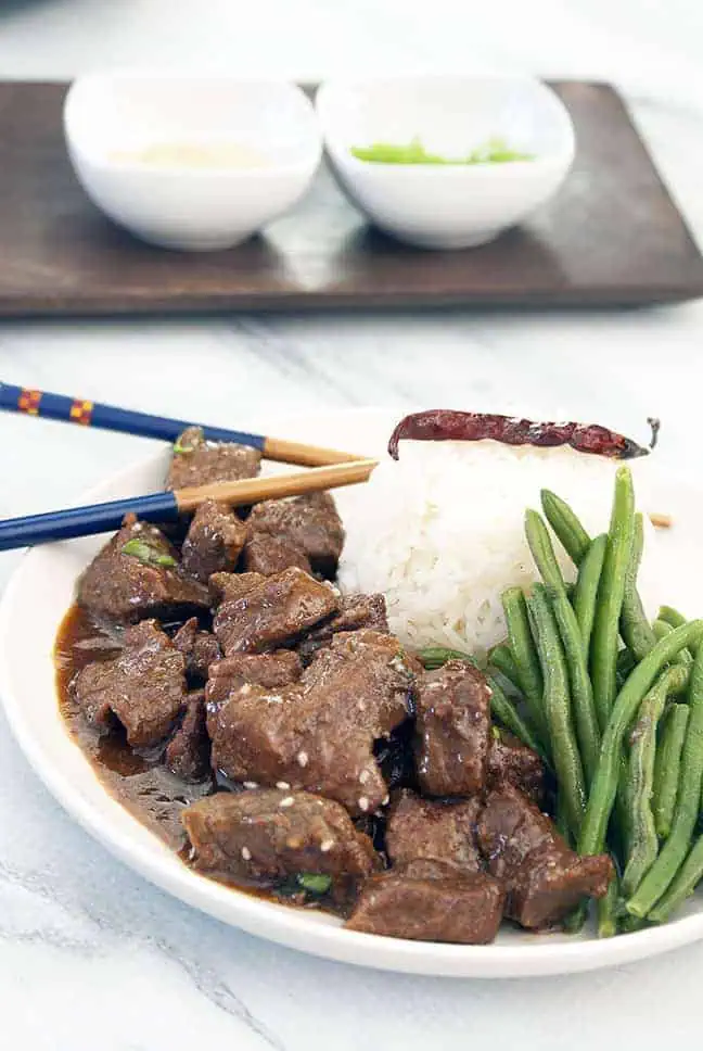 Korean Beef is traditionally known as bulgogi. It consists of stewed beef or beef chuck roast slowly cooked with brown sugar, garlic, and spices. Then it is usually covered in a thick soy sauce slurry giving it a beautiful golden brown color and a tender texture.