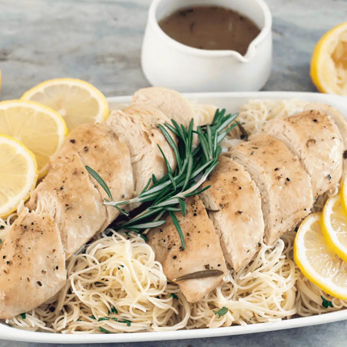 - Remove chicken and place into a slow cooker. To the pan, add lemon juice, chicken broth, and rosemary. Allow to simmer for 1 minute. Remove from heat.