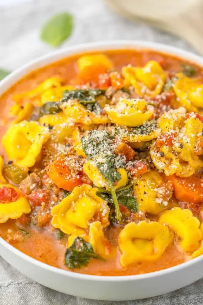 Slow Cooker Tortellini Soup combines hearty Italian sausage, wholesome veggies, a rich tomato broth, heavy cream, and tender cheese tortellini – Perfect for those crisp winter nights, topped with cracked pepper and a sprinkle of Parmesan!