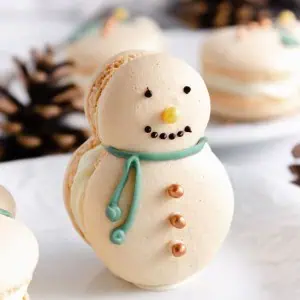 Why make regular macarons this holiday when you could make these stunning Snowman Macarons?! These crispy and sweet snowman-shaped macarons are filled with whipped white chocolate ganache, then decorated with sugar pearls and melted chocolate for the ultimate Christmas treats!