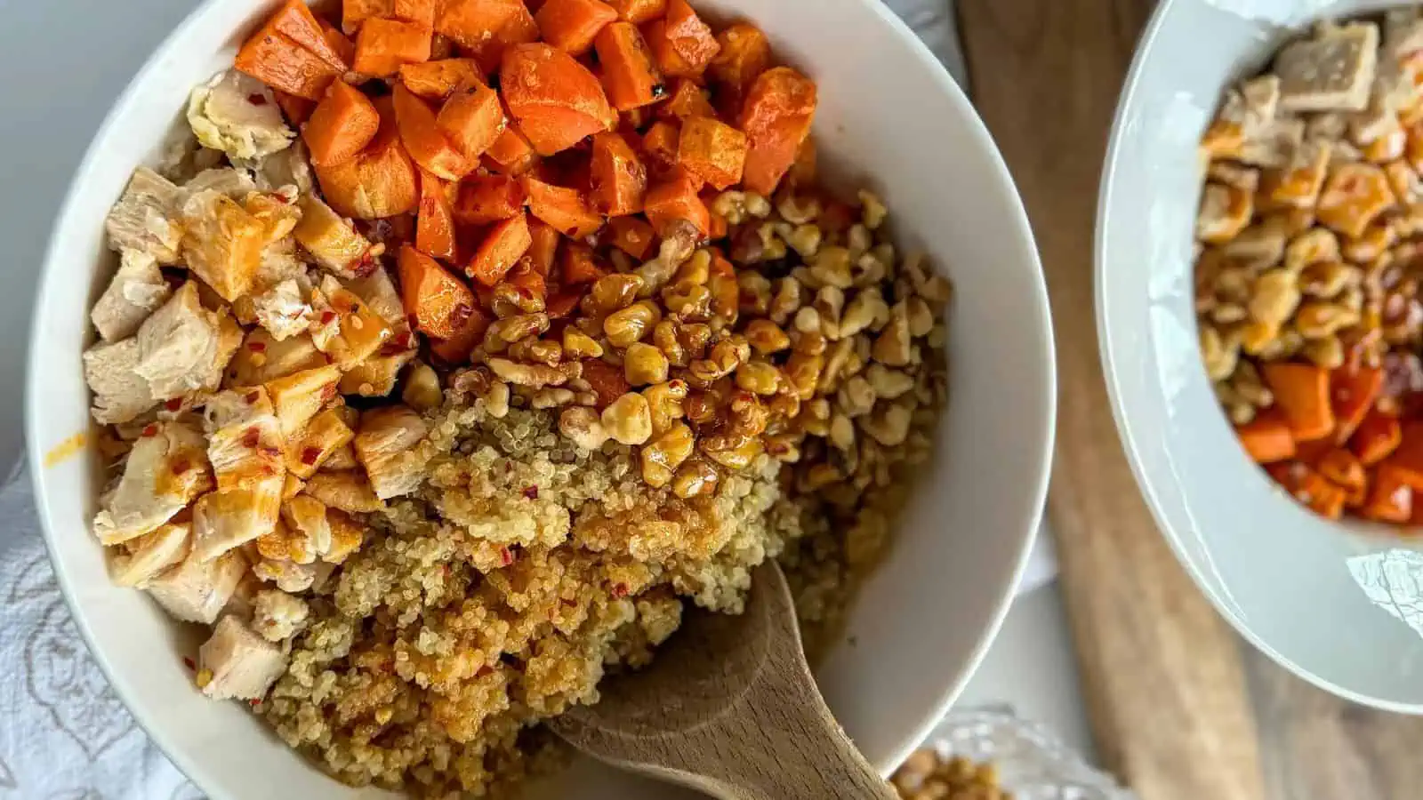 This bowl hits the sweet and spicy notes in a way that’s hard to stop eating. It’s one of those spicy-sweet combo recipes that somehow feels filling but not heavy. The mix of tender sweet potatoes, quinoa, and crunchy walnuts holds up well for leftovers. You can pack it for lunch or keep it in the fridge for grab-and-go meals.