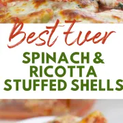 Jumbo pasta shells, loaded with three cheeses and spinach, topped with marinara sauce, and baked to bubbling perfection make this meal perfection. This dish is vegetarian, since itโs made without meat, but even your most dedicated meat-eater wonโt go hungry.