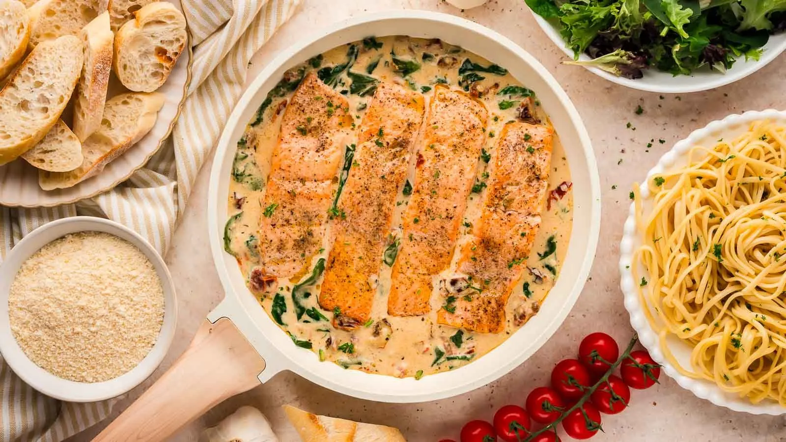 Pan-seared salmon swims in a creamy garlic sauce with sun-dried tomatoes and spinach. It's a Mediterranean-inspired dish that's perfect for spring soirées.