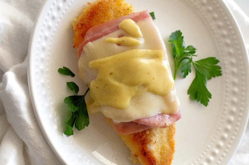 Start with tender chicken breasts, pounded to an even thickness for consistent cooking. Season them with salt, pepper, and garlic powder. Coat the chicken in flour, then dip in beaten eggs before pressing into a mix of breadcrumbs and grated Parmesan. Sautรฉ in olive oil until golden brown on each side and fully cooked through. Top each piece with a slice of Swiss cheese and warm ham, letting them melt under a broiler for a minute. Serve with a side of tangy mustard sauce, enhancing each bite's savory interplay of flavors.
