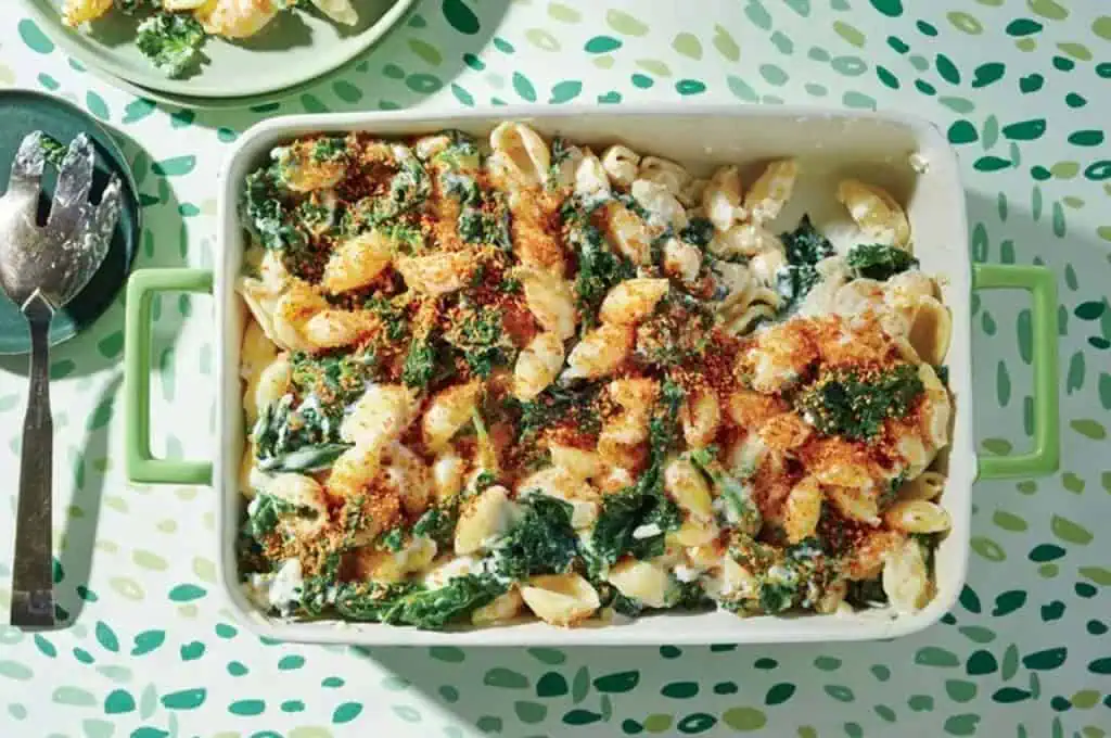 Cook whole-grain pasta until al dente, reserving a cup of pasta water. In a skillet, sautรฉ garlic in olive oil, then add kale, letting it wilt for depth. Combine cooked pasta, kale, and a bit of reserved water with ricotta and parmesan cheese in a baking dish. Stir in lemon zest for brightness and season with salt and pepper. Sprinkle with more parmesan and breadcrumbs. Bake at 375ยฐF until golden and bubbling for a satisfying dish that marries health and comfort.
