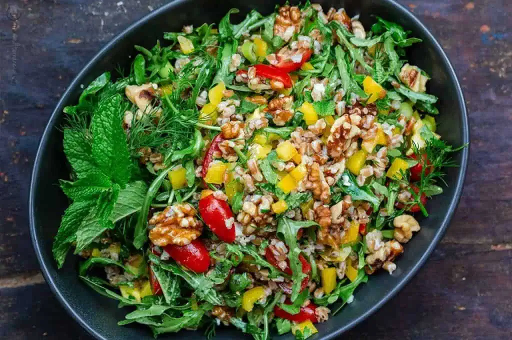 Get the recipe: Mediterranean Farro Salad Recipe with Arugula, Feta and Walnuts