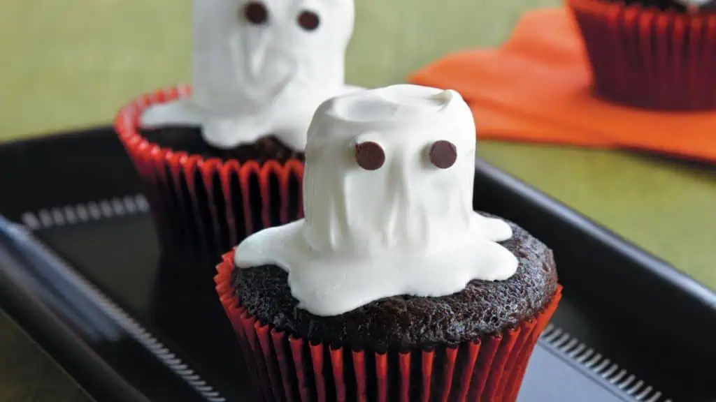 Pipe tall white frosting peaks onto chocolate cupcakes, then gently press a large marshmallow on top. Add two tiny chocolate chips for ghostly eyes. The texture combo of soft marshmallow and creamy frosting makes these extra fun to eat. They’re also an easy make-ahead dessert since they hold up well overnight in the fridge.