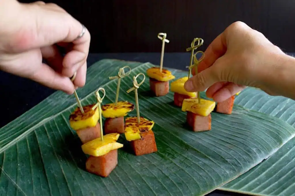 Begin by slicing Spam into uniform squares and pan-frying until golden and crispy, adding flavor depth and texture. Top each piece with a pineapple chunk, secured with a toothpick. The caramelized, subtly salty Spam contrasts wonderfully with the tangy-sweet pineapple. Arrange on a serving plate, garnished with parsley for visual appeal and freshness. This classic combination highlights a perfect balance of savory and sweet, making it a crowd-pleasing, bite-sized treat with hints of tropical allure. Ideal for casual gatherings or retro-themed parties.