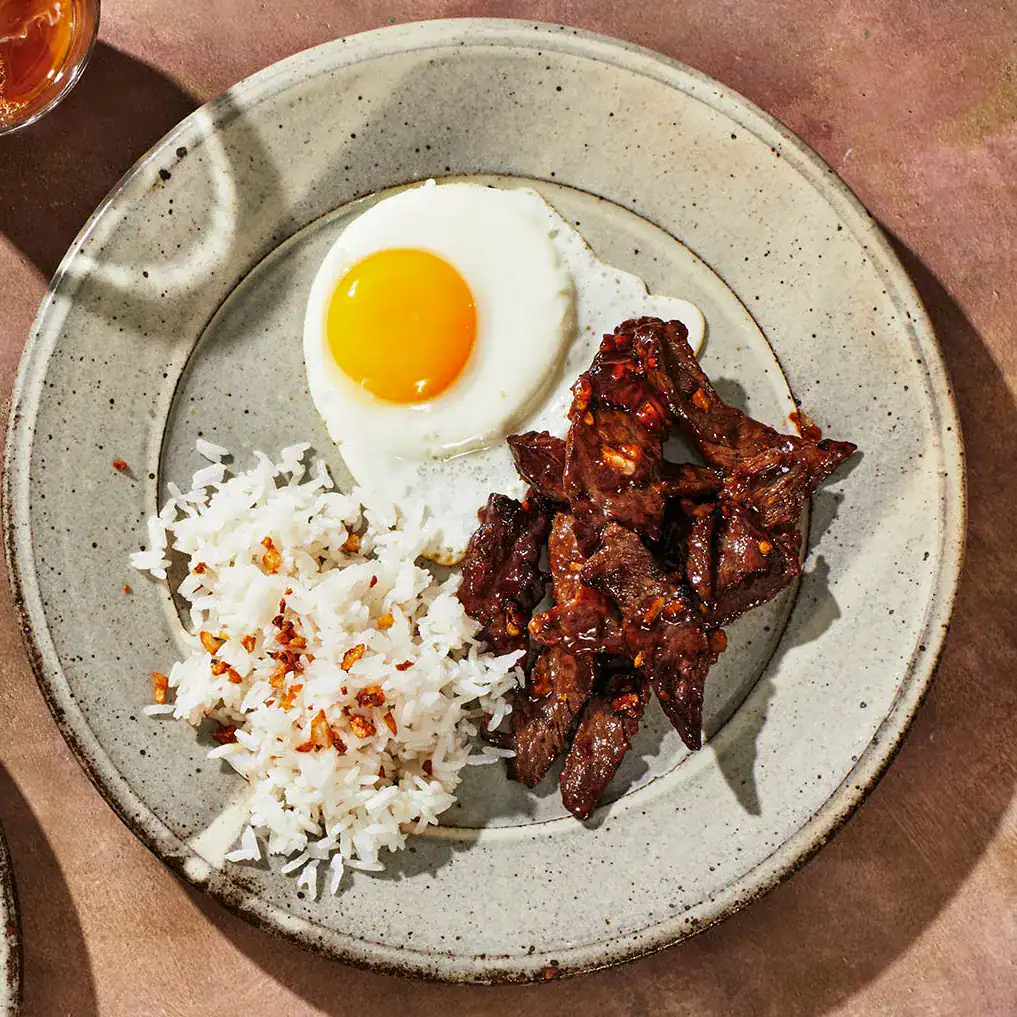 Tapsilog is a hearty Filipino breakfast combination of beef tapa, garlic rice, and fried eggs. The beef is marinated overnight with soy sauce, calamansi, and garlic before being pan-fried to perfection. The name itself is a blend of its components: tapa, sinangag, and itlog. Served with vinegar dipping sauce and pickled papaya, it brings a perfect mix of sweet, savory, and tangy flavors that wake up the senses.