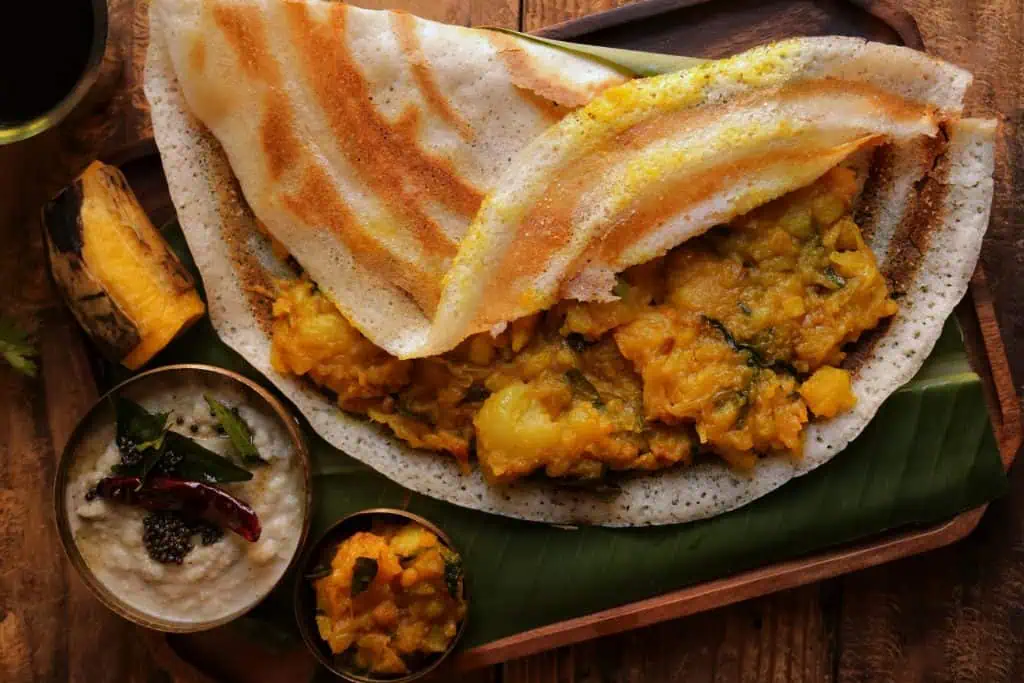 Masala dosa is a classic from South India that combines texture, spice, and balance. The crisp crepe is made from a fermented rice and lentil batter, filled with mashed potatoes cooked in mustard seeds, curry leaves, and turmeric. It is served with coconut chutney and spicy lentil soup known as sambar. This dish offers plant-based protein and energy, making it a flavorful yet wholesome breakfast choice enjoyed across India.