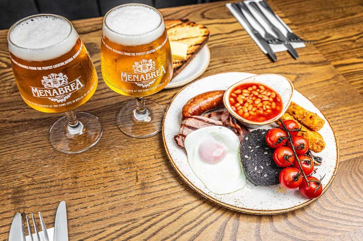 The Full Irish Breakfast is a hearty start to any day, comprised of robust components like bacon, sausages, black and white puddings, eggs, baked beans, mushrooms, and tomatoes. Pan-fry each element separately to maintain their unique flavors, starting with meats to render their fats which enrich the subsequent ingredients. For a traditional touch, include sliced soda or potato bread, frying them until crispy on the outside. The goal is a varied texture and a harmonious blend of savory, slightly sweet, and earthy tones. This iconic meal exemplifies the rich culinary tradition of Ireland.