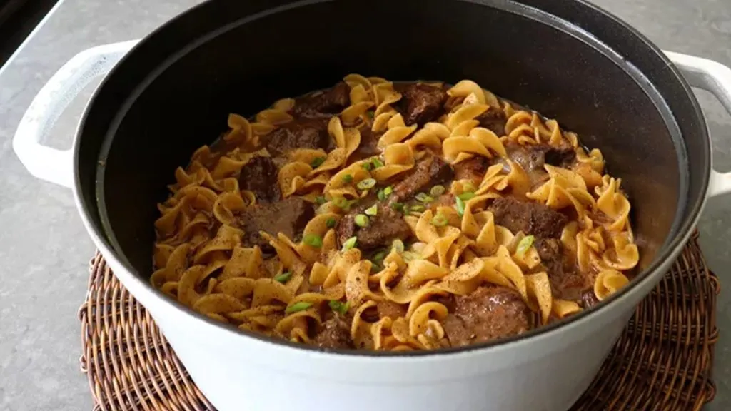 Start by browning stewing beef cubes in a heavy-bottomed pot, ensuring a deep caramelization for maximum flavor. Remove the beef and sautรฉ onions and garlic in the rendered fat until soft. Return the beef, cover with beef broth, and braise gently until the meat is tender. Add egg noodles, ensuring they absorb the robust flavors of the broth. Once cooked, finish with a splash of cream for richness. Season with salt and pepper, and garnish with fresh parsley for a fragrant finish. This dish embodies hearty simplicity.