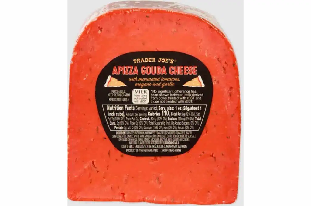 Apizza Gouda Cheese from Trader Joe's is a culinary gem that marries the rich creaminess of Gouda with savory pizza-inspired seasoning. Perfect for melting, it adds a smoky, cheesy depth to various dishes. Incorporate it into a homemade pizza for an elevated twist or grate over hot pasta to enhance its flavors. Its meltability ensures it blends seamlessly into sauces, providing a sumptuous, velvety texture. Whether used as a key ingredient or a flavorful garnish, this cheese transforms meals into extraordinary gustatory experiences.