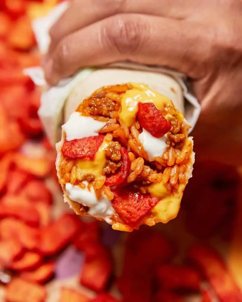 This burrito became a sensation with its mix of seasoned beef, rice, Nacho Cheese Sauce, and the unexpected crunch of Flamin' Hot Fritos. The secret to recreating this beloved item lies in perfecting the crunchy element, ensuring it stands up to the burritoโs soft textures. Spread the Fritos evenly and wrap the burrito just before serving to maintain the crunch. The combination of creamy, spicy, and crunchy in every bite is what makes this burrito stand out, and mastering those elements is key to its success.