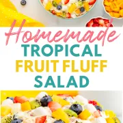 Leftover tropical fruit marshmallow fluff should be stored in an airtight container or the serving bowl, covered with plastic wrap, in the fridge for 3-4 days. It’s best to give the tropical fluff salad a little mix before serving again, as some of the juices from the dessert could have separated in storage.