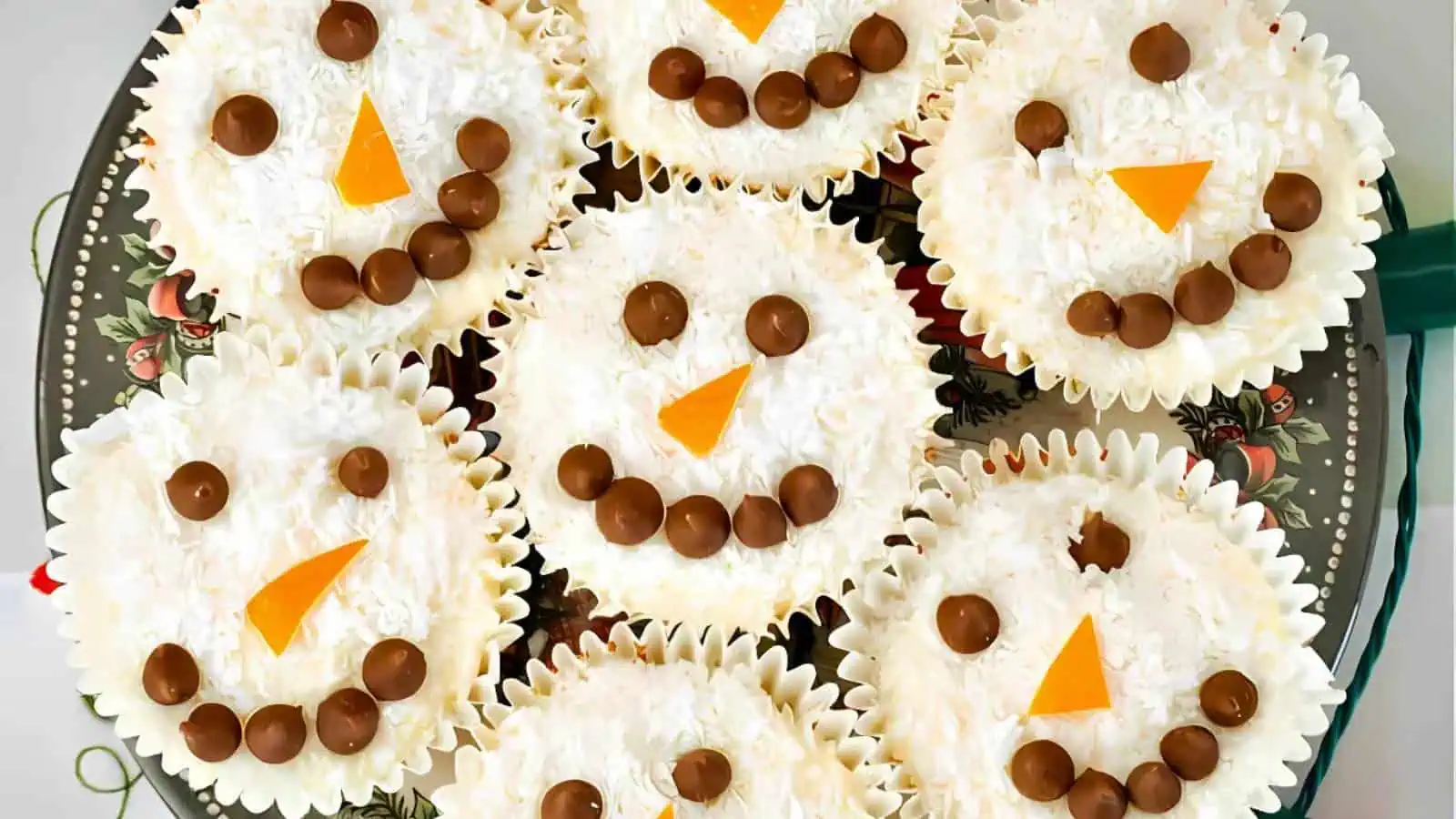These coconut-topped snowman cupcakes are adorable Christmas cupcakes that look as festive as they taste. Made from scratch and decorated with chocolate chips and orange peel, theyโ€™re an easy way to add a whimsical touch to your holiday table. A must-try for any winter gathering!