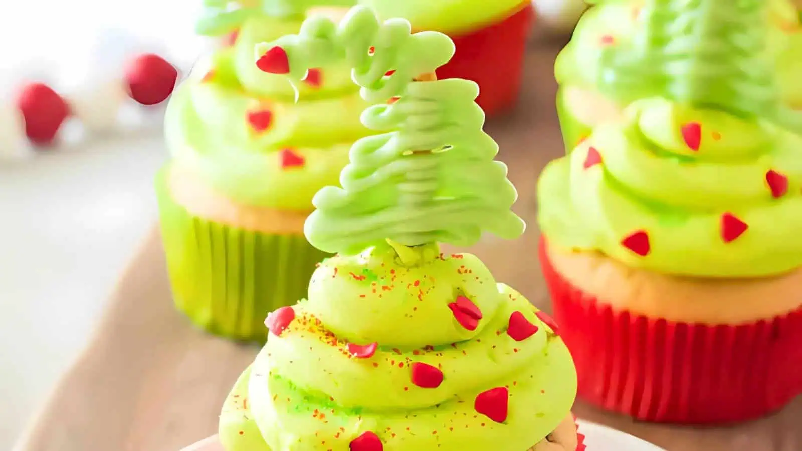 These Grinch-inspired cupcakes with peppermint frosting make adorable Christmas cupcakes everyone will enjoy. The bright green frosting and โ€œWhovilleโ€ tree topper are bound to catch eyes and hearts alike. Perfect for Grinch fans, they add a whimsical twist to holiday sweets!
