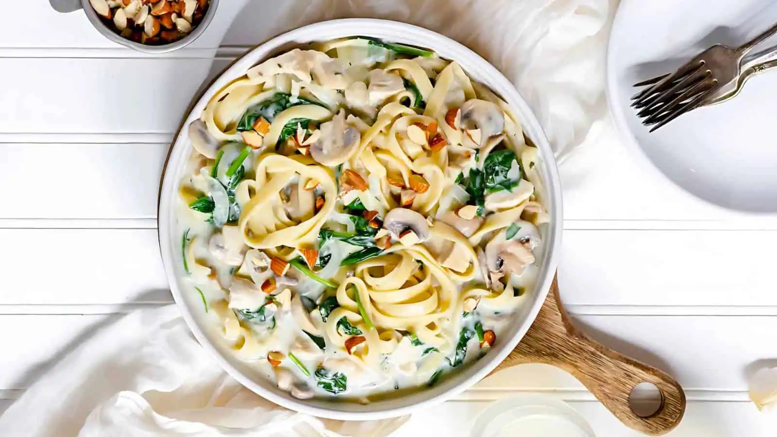 This creamy chicken Florentine dish gets a nutty twist from almonds, pairing them with garlic, mushrooms, and fresh spinach. This almond recipe is hearty, flavorful, and made with pantry-friendly ingredients. Serve it over pasta for an easy dinner.