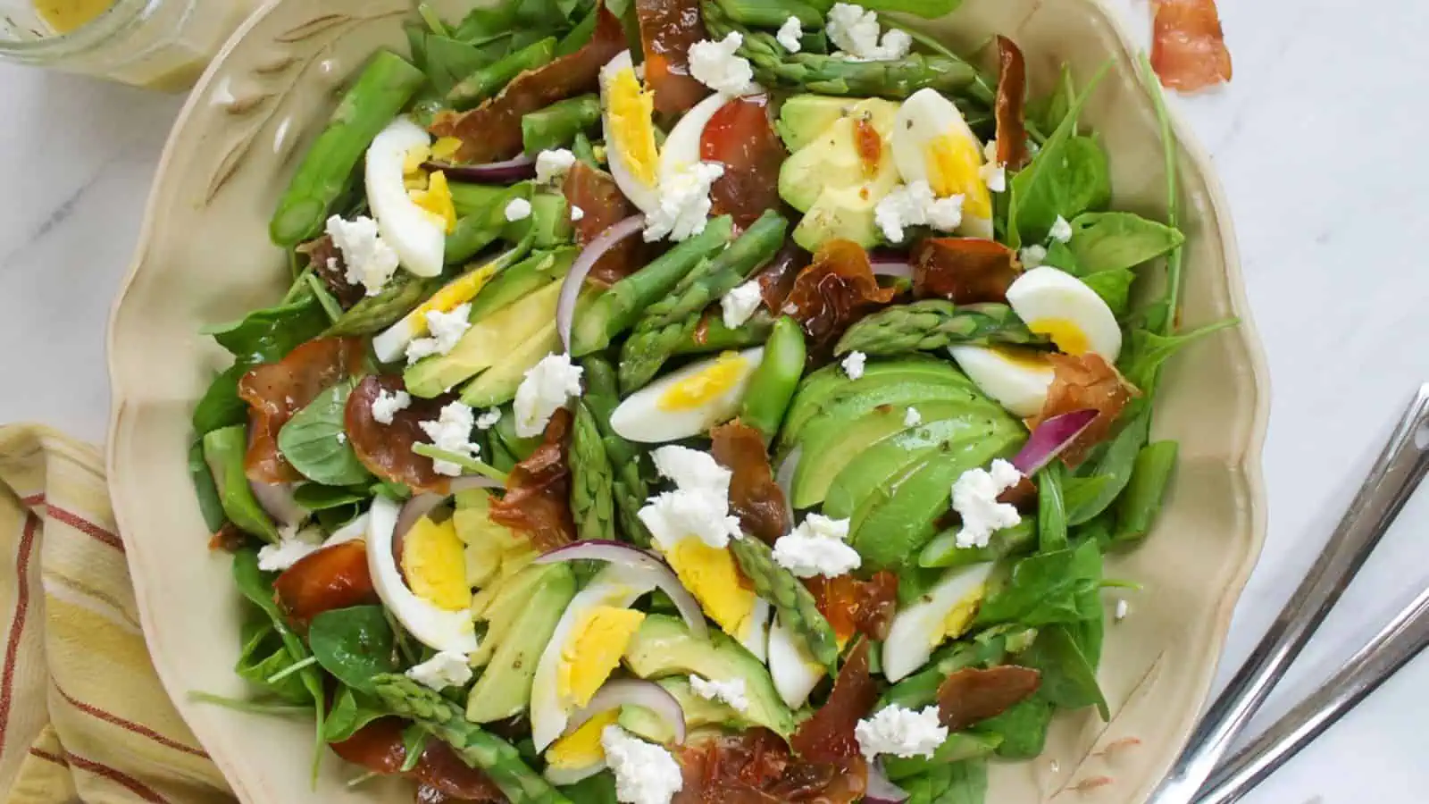 This salad is loaded with spring favorites like asparagus, avocado, and goat cheese. The crispy prosciutto adds texture and saltiness without needing croutons. Itโs hearty enough for lunch but also pairs nicely with grilled mains. (Uses “asparagus recipes”)
