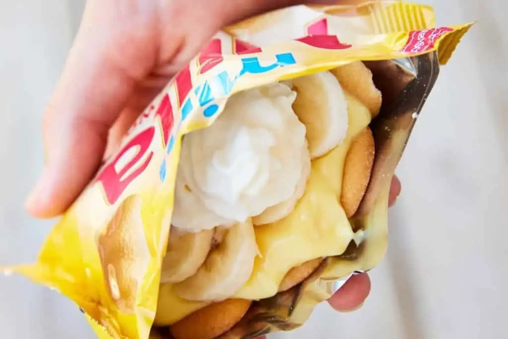 Walking Banana Pudding is the dessert twist on Walking Tacos. Think individual banana puddings served right in mini Nilla Wafer cookie bags! Itโs one of the easiest handheld desserts, ready in just minutes and perfect for enjoying on the go.