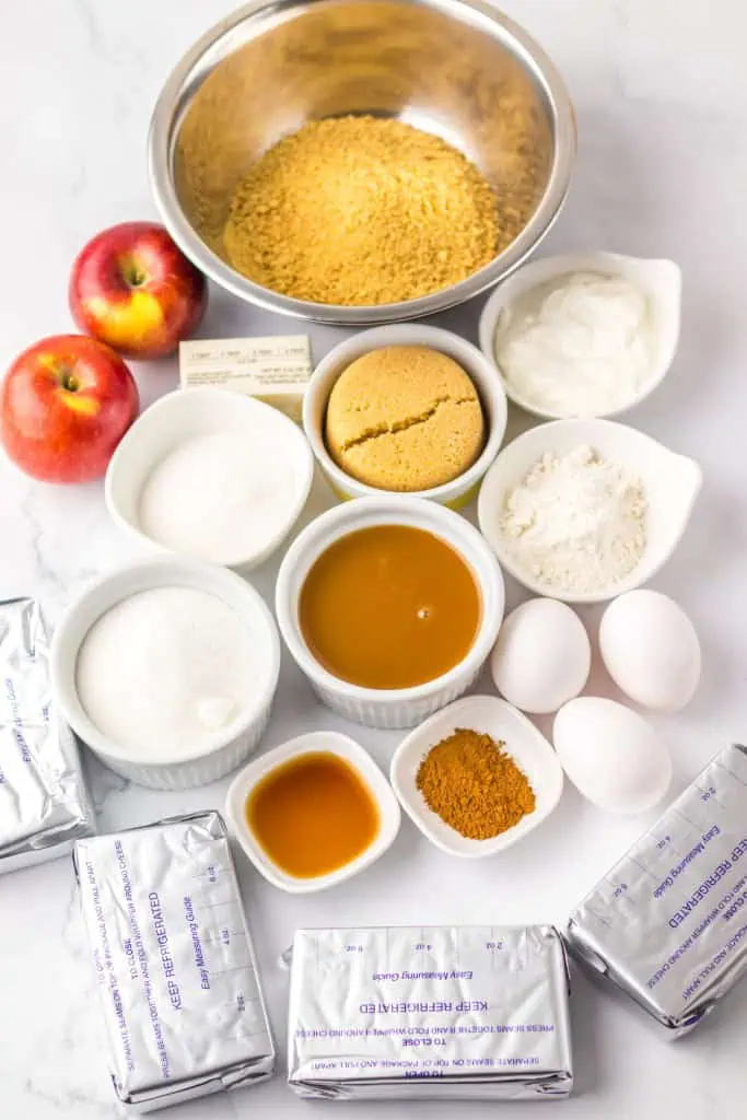 - The crust – Graham cracker crumbs, melted butter, and granulated sugar.