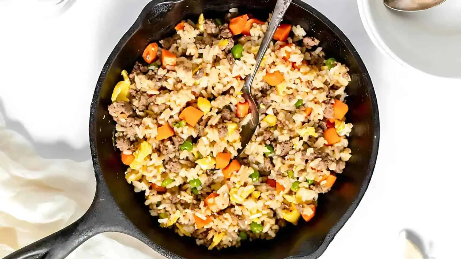Ground beef fried rice is a speedy weeknight fix that you can make in one skillet. The cast iron helps develop a nice sear on the beef, making this a standout dish for any collection of cast iron dinner recipes.