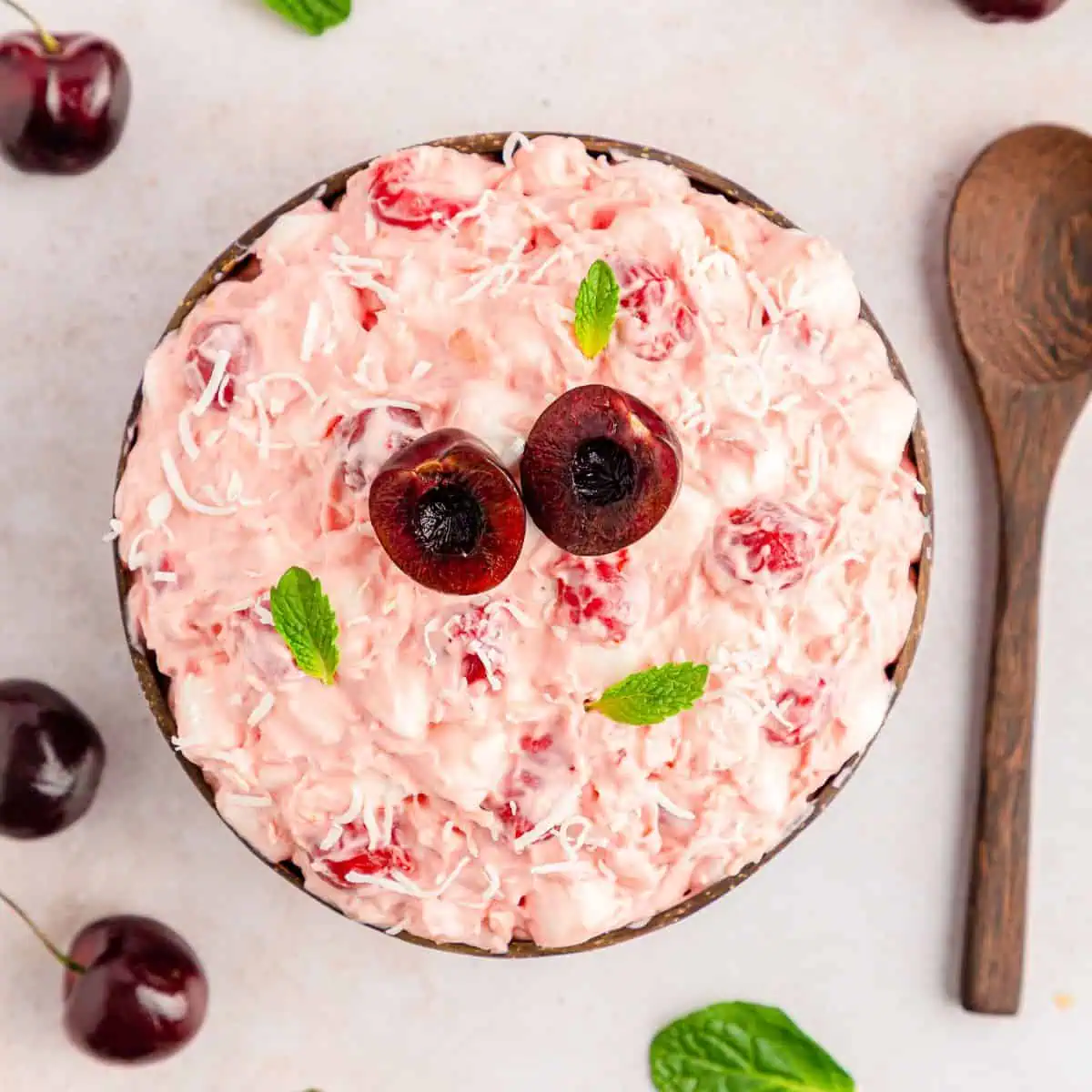 - Top this cherry fruit salad with chopped nuts, extra shredded coconut, chocolate shavings, and cherries.