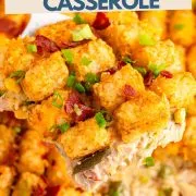 - Meat – Shredded rotisserie chicken and crumbled bacon provide a meaty addition to this tater tot casserole.