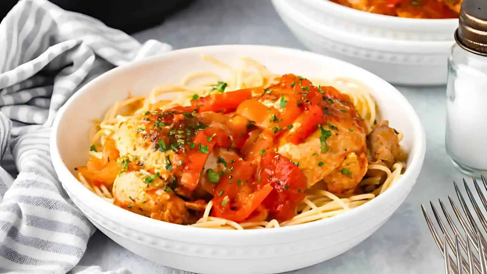 Slow-cooked in a tomato-based sauce with bell peppers and mushrooms, this dish is hearty and comforting. One of the best chicken thigh recipes for a set-it-and-forget-it meal.
