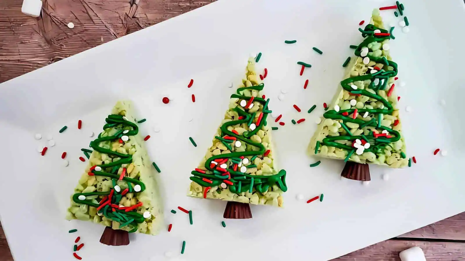 These Rice Krispie treats are transformed into Christmas trees with just a few easy steps. Decorated with sprinkles and icing, theyโre a fun project for kids and adults alike. A playful option for Christmas tree recipes, theyโre perfect for parties or snacking.