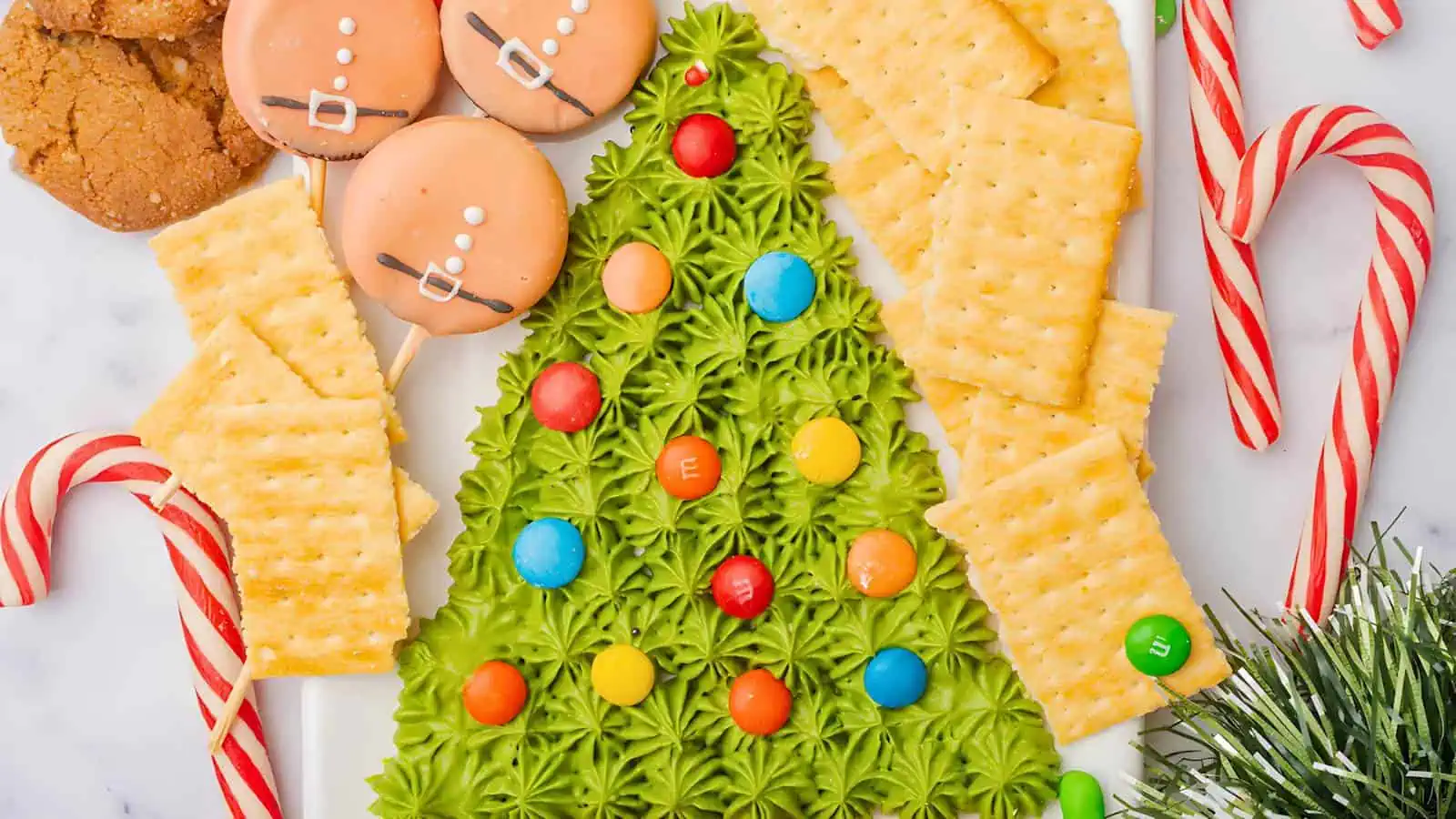 This frosting board is a playful take on a dessert charcuterie board. Designed in a Christmas tree shape, itโs perfect for dipping cookies or fruit into vibrant and creamy frostings. As part of your Christmas tree recipes, itโs sure to be the centerpiece of your holiday dessert table.