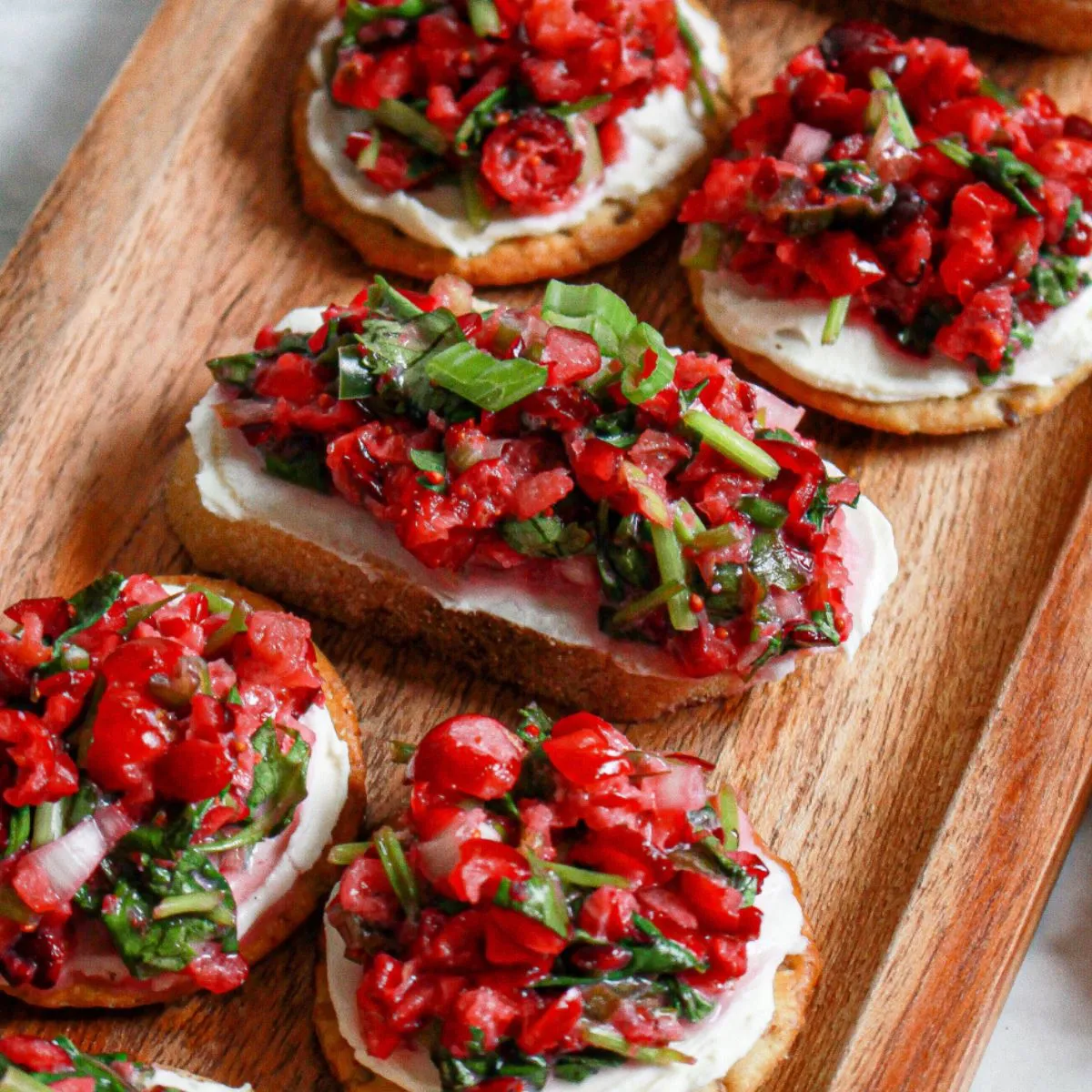 Side view of bruschetta with cream cheese spread and topped with cranberry jalapeno salsa.