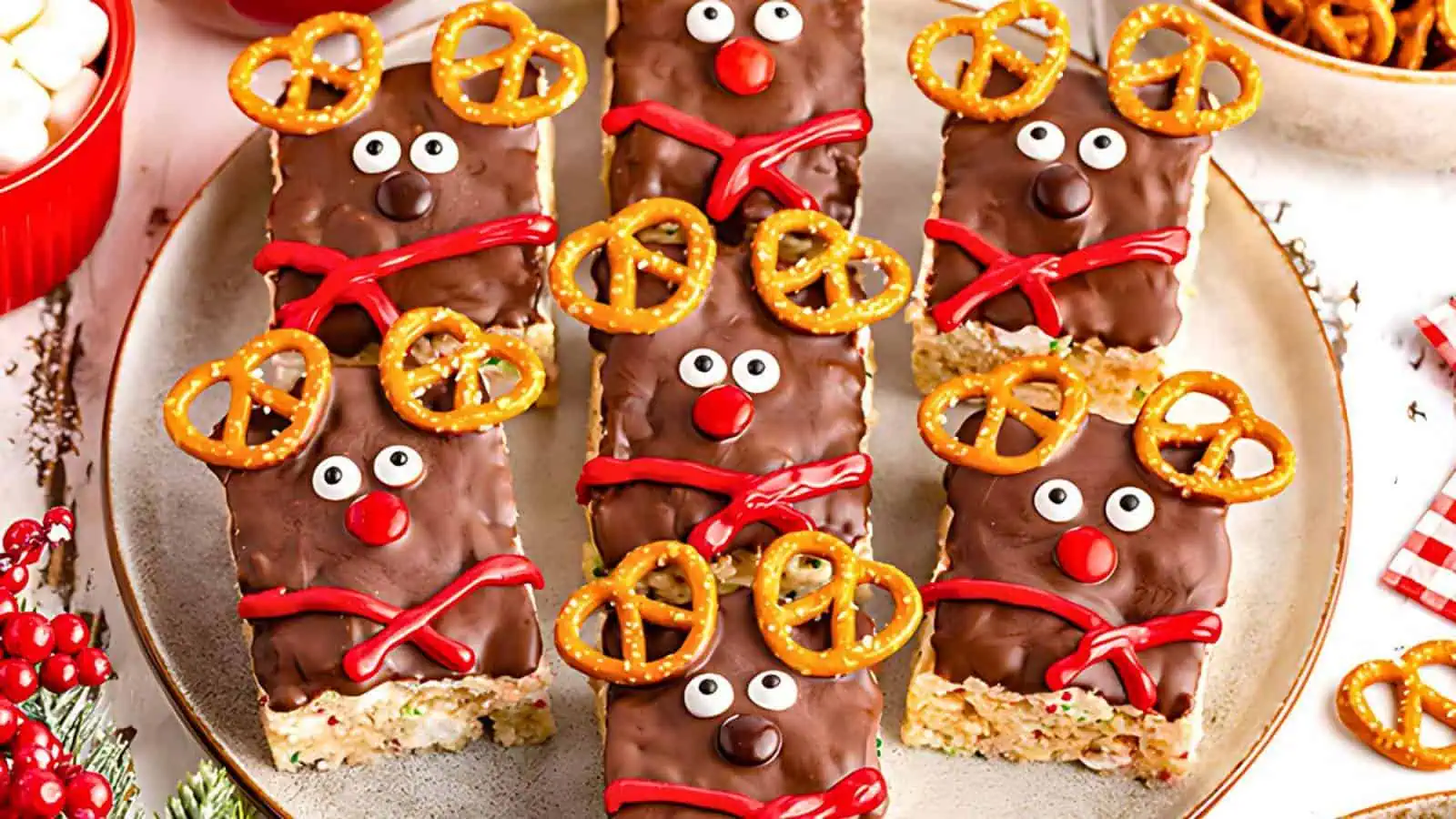Classic Rice Krispies with a festive twistโthese reindeer treats are cute and easy Christmas snacks that will get everyone smiling. Topped with chocolate faces and pretzel antlers, theyโre a fun, kid-friendly addition to your holiday lineup.
