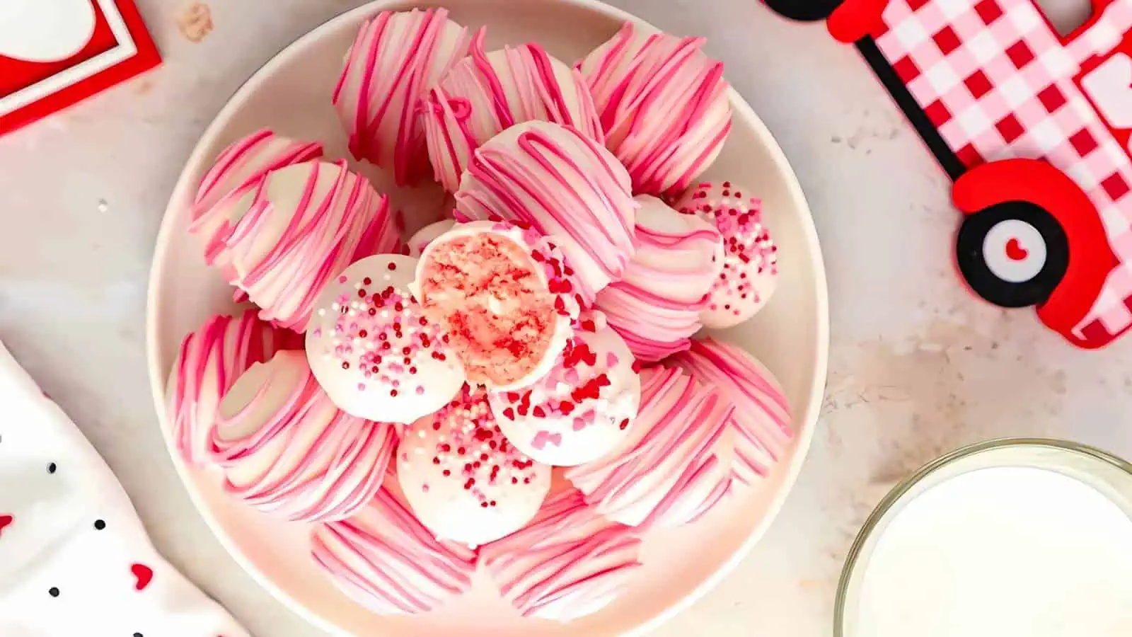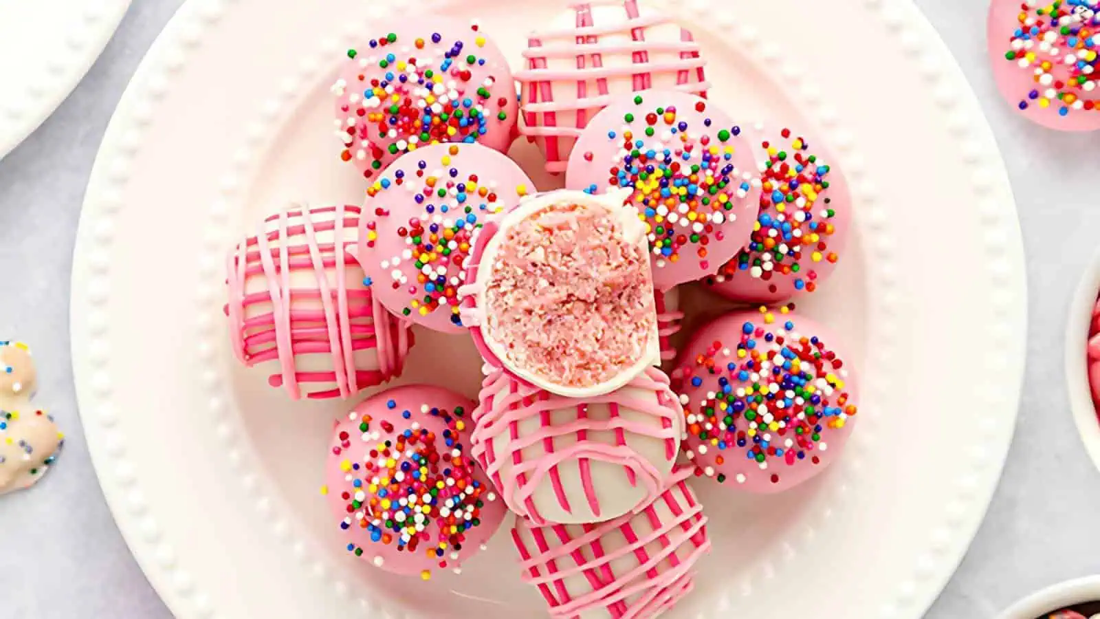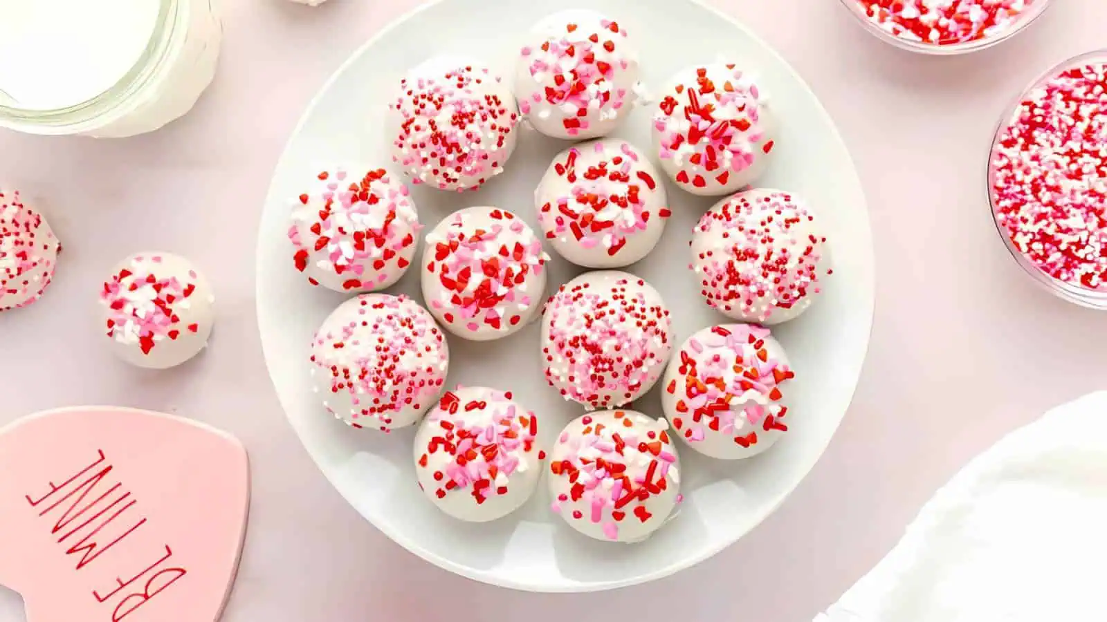 Strawberry Cheesecake Balls are a colorful and festive option for dessert balls, with a creamy filling and a white chocolate shell. Topped with pink chocolate and sprinkles, these truffles are perfect for Valentineโs Day or any celebration.
