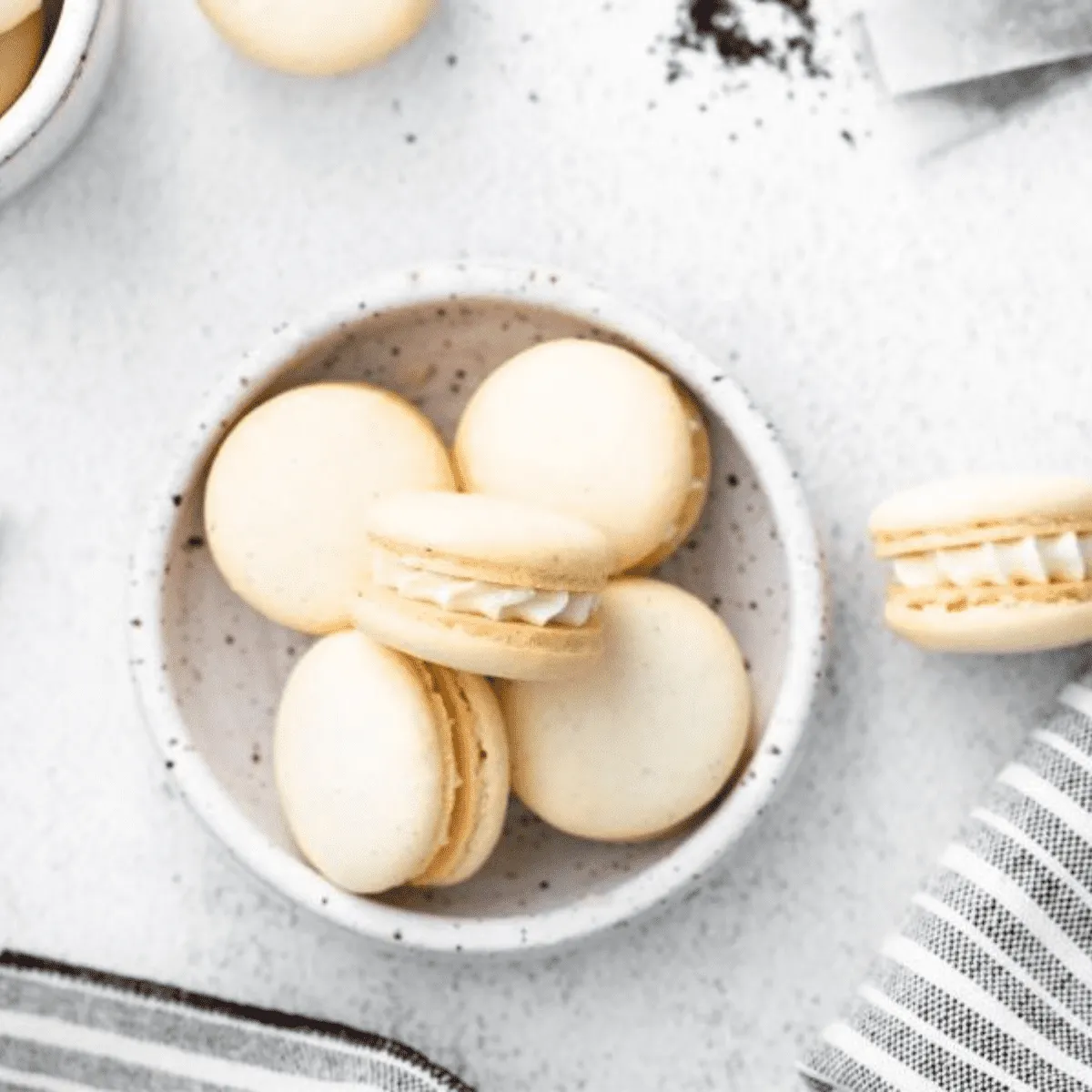 Earl Grey Tea Macarons in a white bowl with black specks.
