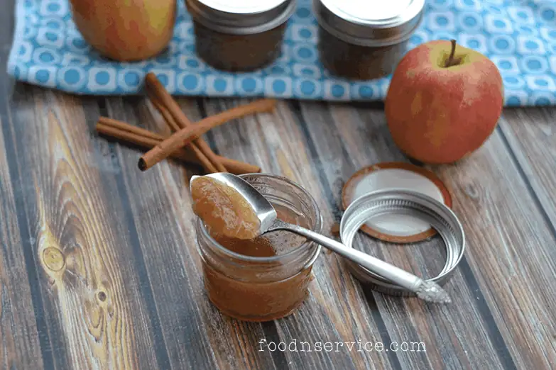 - In a large sauce pan place apples. Add 1 cup of sugar and apple cider. Over a medium heat let fruit cook for about 10-15 minutes. Once fruit comes to a boil add one package of fruit pectin. Stir fruit so it does not stick. Continue cooking over a medium heat until sauce becomes thick.