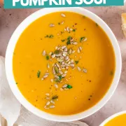 This Easy Pumpkin Soup Recipe is rich and creamy with sweet and savory flavors. The cinnamon and maple syrup turn it into an instant hit for the family to enjoy at Thanksgiving or during the fall, although it's just as great any time of the year!