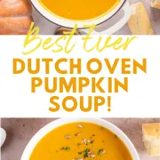 This Dutch oven soup recipe is perfect to serve alongside crusty bread, breadsticks, flaky buttermilk biscuits, grilled cheese sandwiches, and so much more. Once ladled into serving bowls, garnish this pumpkin soup with a dollop of sour cream, freshly chopped herbs, and roasted pumpkin seeds.