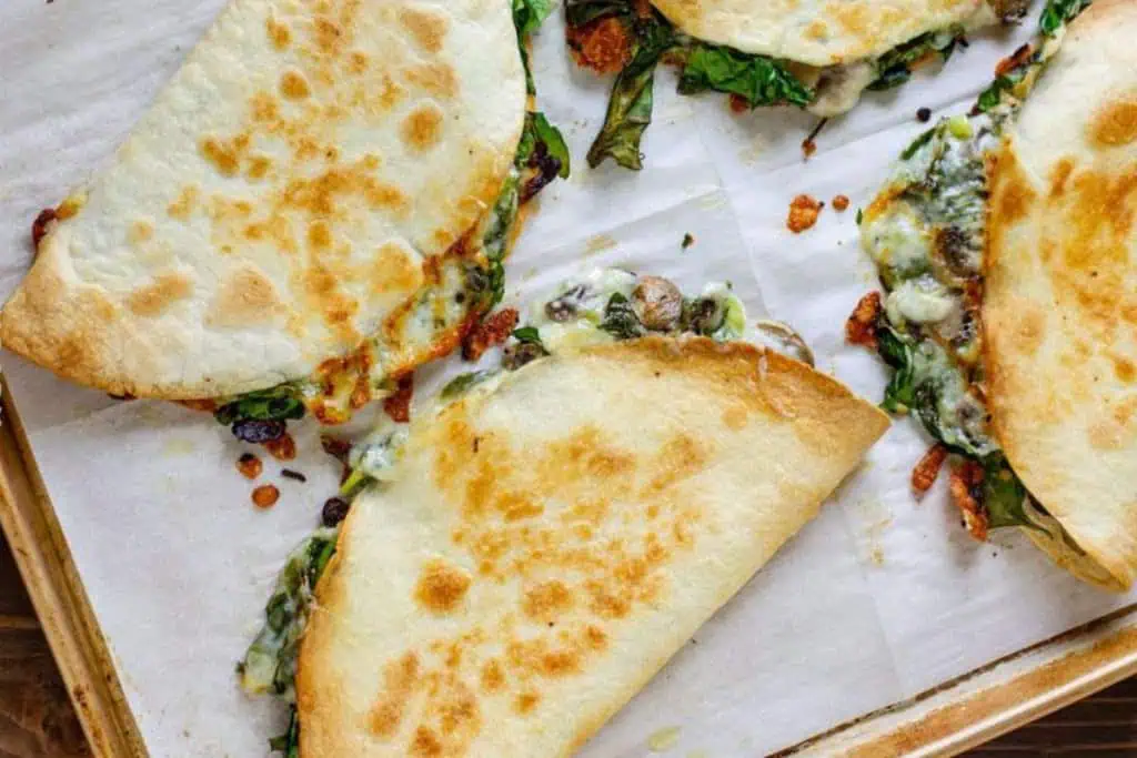 These Baked spinach and mushroom quesadillas are crispy, delicious, and full of delicious nutrition. And baking these quesadillas allows you to make many at once, so you can feed your hungry family quickly and easily!