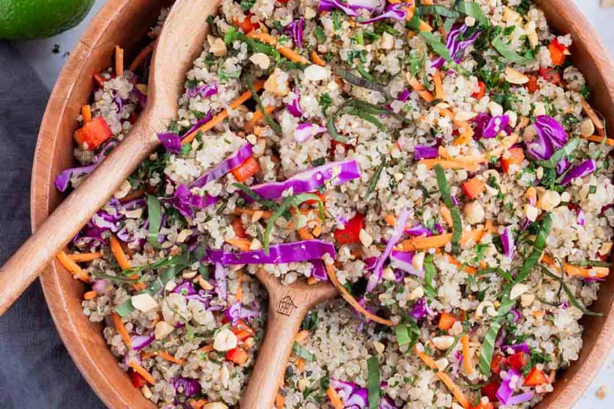 Bold and beautiful, this Thai Peanut Quinoa Salad recipe is as delicious as it is gorgeous! Itโ€™s full of healthy carrots and cabbage, protein-packed quinoa, crunchy peanuts and finished with a homemade Thai peanut salad dressing.