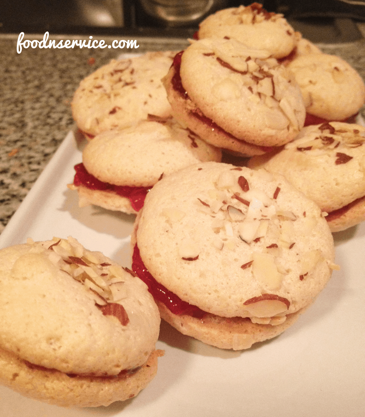 - Place powdered sugar and almond meal in a sifter, and sift the mixture into your egg whites and lightly fold them them in.