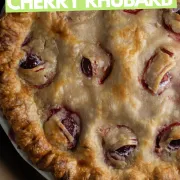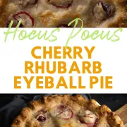This Halloween pie adds a fun and spooky holiday twist to regular cherry rhubarb pie. Leftover pie pastry is creatively used to make an eyelid effect, housing a single cherry to resemble a bloody eye!!
