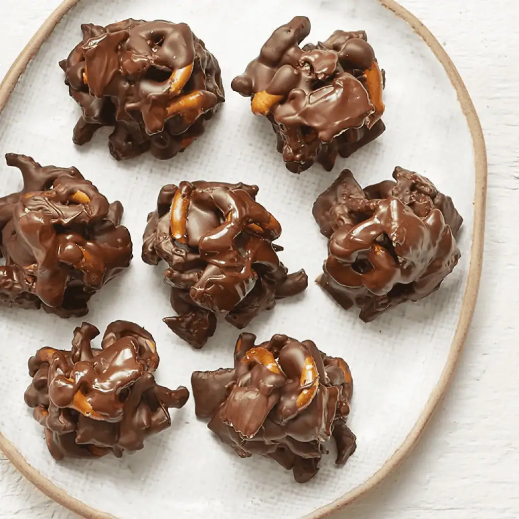 Chocolate-covered pretzel clusters combine salty crunch with smooth sweetness in a way that feels balanced and satisfying. Simply fold melted chocolate together with pretzels, nuts, or cereal, then spoon small mounds onto parchment paper to set. A light drizzle of extra chocolate over the top adds texture and a layered look. Once firm, arrange them neatly on a plate or tiered stand. The finished presentation appears thoughtfully composed, even though the preparation requires minimal effort and no baking.