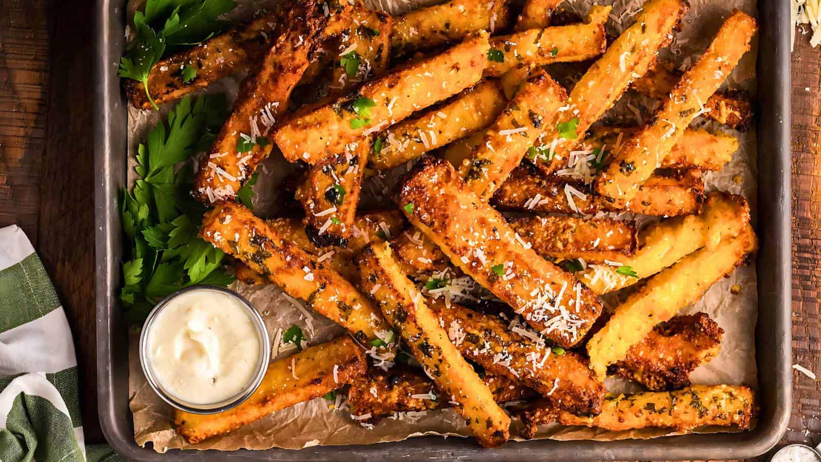 Air Fryer Parmesan Truffle Polenta Fries are a standout among French fry recipes with their unique and luxurious flavor. The crispy exterior and rich truffle mayo dipping sauce make them a sophisticated choice for any gathering or appetizer.