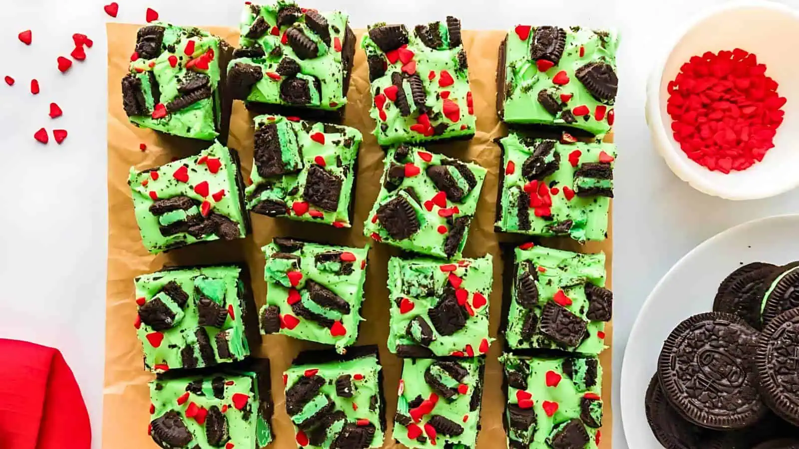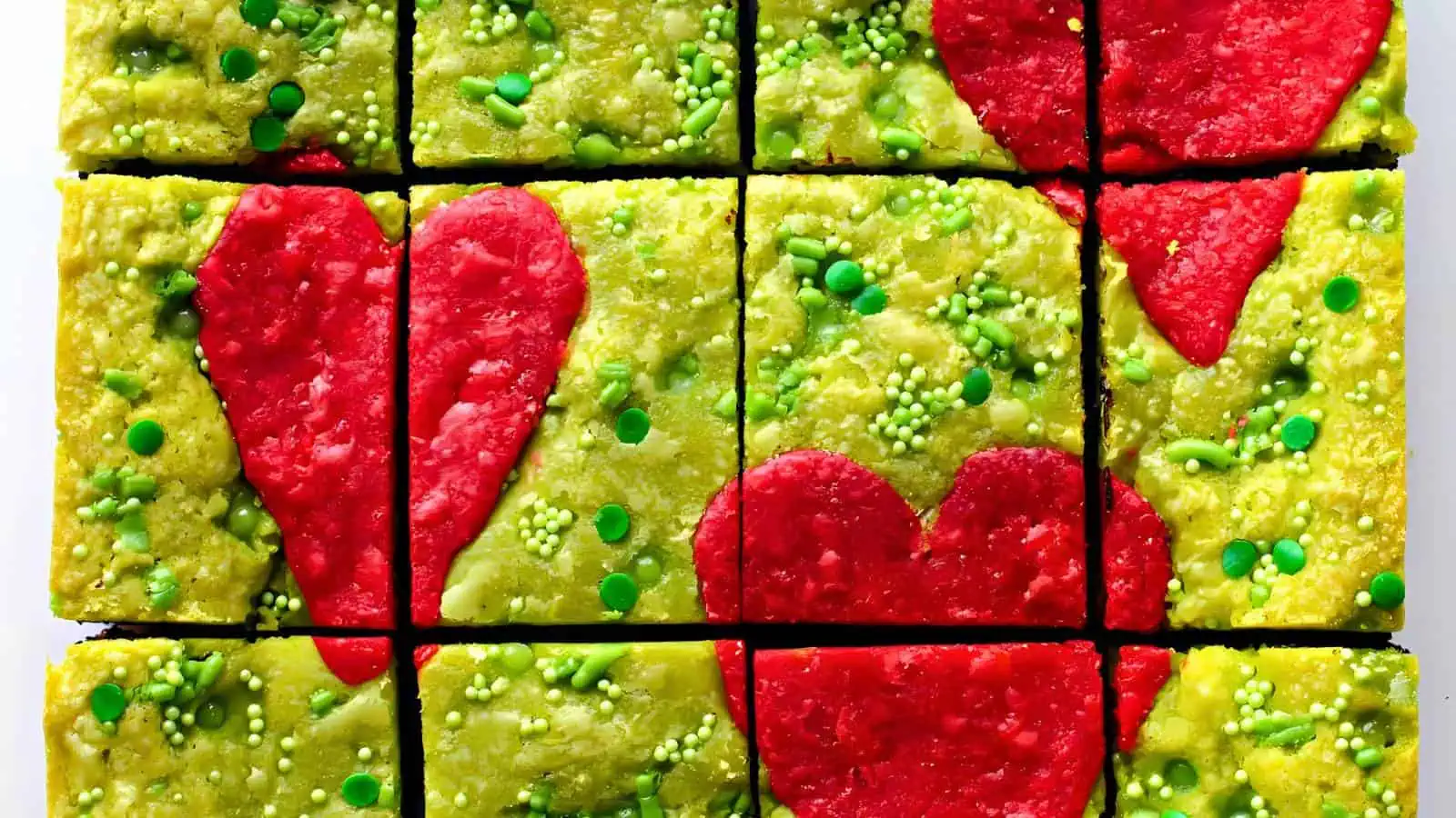These grinch brownies, with a layer of fudgy chocolate and a green blondie topping, are perfect for Grinch inspired desserts. Each brownie is topped with a red candy heart, making it festive and fun for all ages. Add these to your holiday spread for a sweet treat that everyone will love!