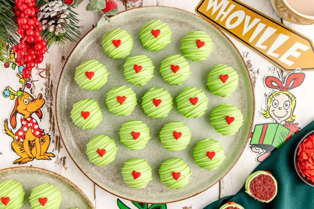 Grinch truffles combine creamy golden Oreos with green chocolate and a red candy heart on top. They’re as festive as they are delicious, making them a great choice for Grinch-inspired desserts. These treats bring a little mischief and holiday cheer to any celebration.